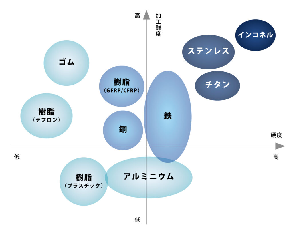 試験片はさまざまな素材を使って作られます。鉄やアルミといったおなじみの金属から、チタンやインコネルのような普段触れることの少ない材料まで、素材ごとに特徴や性質は大きく異なります。以下は、ムソー工業で加工実績のある試験片素材の一例と、それぞれの硬度・加工難度を示した表です。