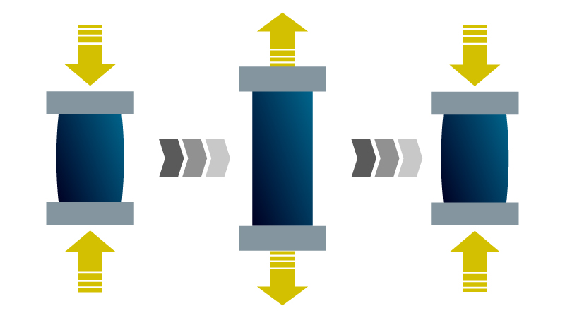 材料を押し潰すように圧縮する荷重をかけ、その強度や変形特性を評価する試験です。製品の安全性や耐久性を確かめるために行われます。