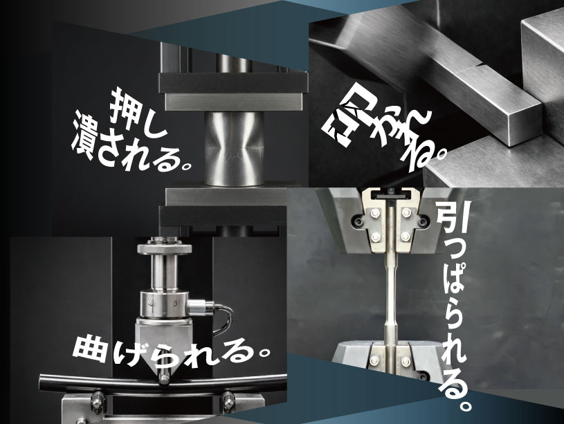 材料試験にはさまざまな種類があり、どんな状況でどんな力が加わった時に素材がどこまで耐えられるかを試験を通して確認します。例えば、強度を評価するためには試験片を両側から引っ張る「引張試験」を、寿命を確かめるためには荷重を加える「疲労試験」を、といったように最終製品の用途に応じた試験方法を実施します。